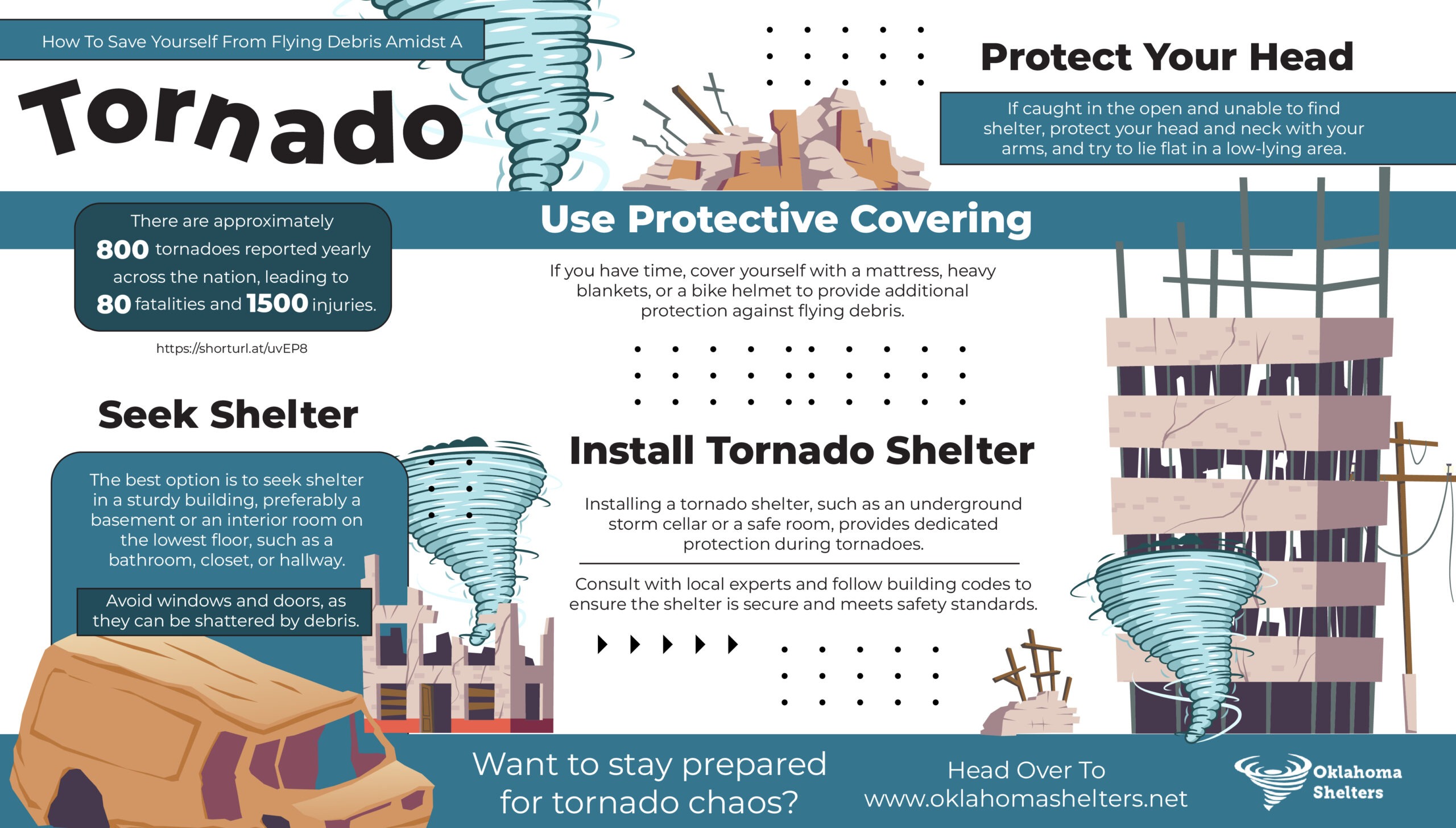 There are approximately 800 tornadoes reported yearly across the nation, leading to 80 fatalities and 1500 injuries.